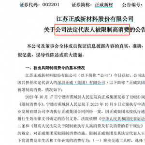 正威新材表示,该限制消费令属于对正威集团及其法定代表人(王文银)发出的限制消费令,对本公司经营并无较大影响。