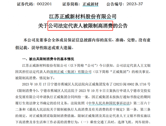 10月18日晚间,正威新材发布公告称,公司法定代表人王文银因其担任法定代表人的深圳正威(集团)有限公司(以下简称“正威集团”)的相关事宜,被限制高消费。