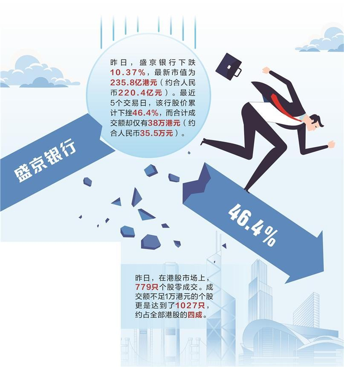 昨日,盛京银行下跌10.37%,报收2.68港元/股,总市值为235.8亿港元(约合人民币220.4亿元)。最近5个交易日,该行股价累计下挫46.4%,而合计成交额却仅有38万港元。