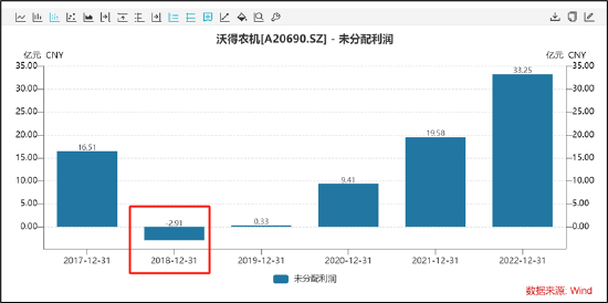 我们发现,沃得农机2018年未分配利润为-2.91亿元,而同期现金分红为26亿元,公司究竟有没有违规分红?对于现金分红,一般基于以母公司或合并报表口径的可供分配利润孰低的原则,若可供分配利润出现负数,进行现金分红则属于违规情形,反之则不属于。Wind数据显示,沃得农机2018年年初未分配利润金额16.51亿元,当期公司净利润为7.28亿元,公司当期可供分配利润较大,或匹配相关分红规则。