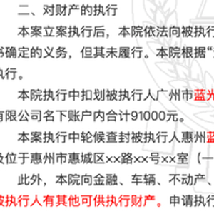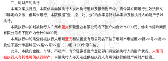 如广州市三湾田装饰工程有限公司与蓝光发展子公司们的诉讼中,法院在执行中扣划被执行人广州市蓝光和骏置业有限公司名下账户内合计7.9万元、佛山市炀玖商贸有限公司名下账户内合计9.1万元。合计还不到20万。