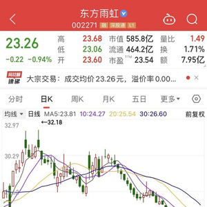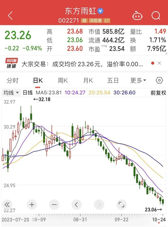 近日,东方雨虹股价持续在走下坡路。截至发稿前报23.26元/股,下跌0.94%,最新市值约586亿元。