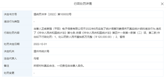 凤凰网《风暴眼》在天眼查上看到,此事最终以正威被处罚告终。当年8月,因“实施了统计调查对象提供不真实统计资料的违法行为”,正威泰强公司被罚款12万元。