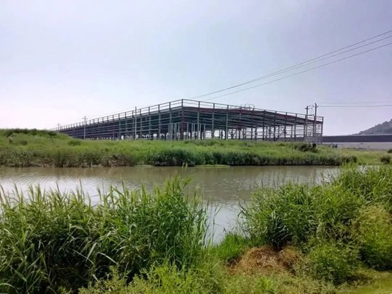 但凤凰网《风暴眼》于9月下旬走访园区数日,发现直至目前,整个园区仅有铜杆厂已建设完成。与铜杆厂隔着一条小河的,是施工一半的高导车间。从外观上看,这个厂房一半只有钢架结构,另一半则已经筑好外墙,门窗尚未安装。