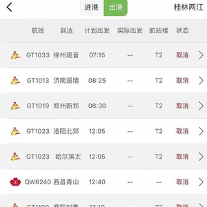 桂林两江机场11月3日出港取消航班计划,GT为桂林航空代码。图片来源:航旅纵横截图