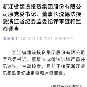 11月5日,浙江省纪委监委官微发布,浙江省建设投资集团股份有限公司原党委书记、董事长沈德法涉嫌严重违纪违法,主动投案,目前正接受浙江省纪委监委纪律审查和监察调查。