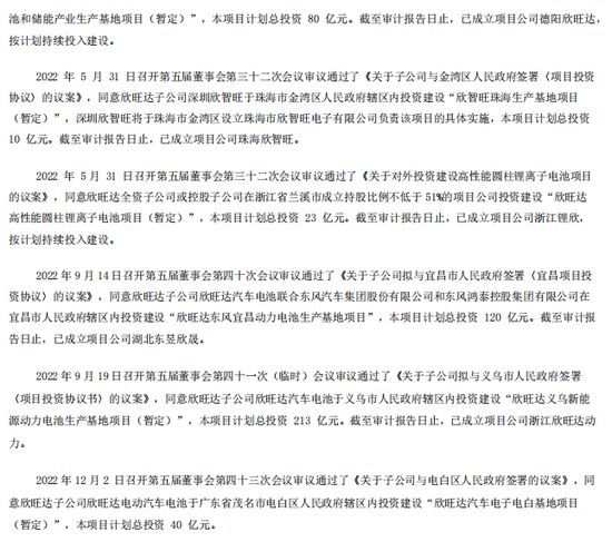 如2022年3月17日于什邡市辖区内投资建设“欣旺达什邡动力电池和储能产业生产基地项目”,计划总投资80亿元;9月14日在宜昌市辖区内投资建设“欣旺达东风宜昌动力电池生产基地项目”,本项目计划总投资120亿元;9月19日于义乌市辖区内投资建设“欣旺达义乌新能源动力电池生产基地项目”,本项目计划总投资213亿元等。