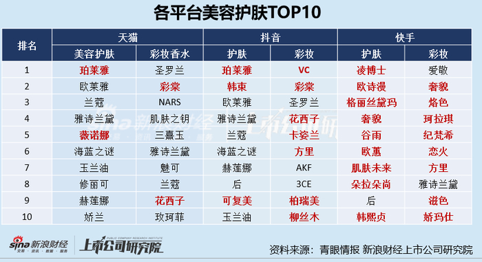 抖音平台护肤TOP10中,国产品牌位居前列,珀莱雅旗下“珀莱雅”品牌、上美集团旗下的“韩束”品牌、巨子生物旗下的“可复美”分别位列第1、第2、第9;彩妆TOP10中则大多为国货品牌,如上市公司珀莱雅旗下的“彩棠”品牌、贝泰妮参与领投的国货美妆品牌“方里”等。