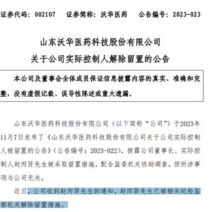 11月22日,沃华医药公告称,近日,公司收到董事长、实际控制人赵丙贤的通知,赵丙贤已被相关纪检监察机关解除留置措施。