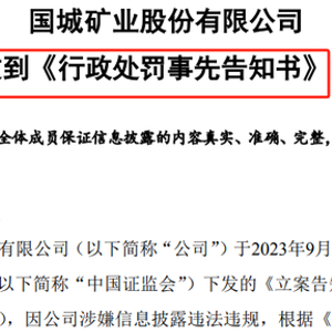 公告显示,国城矿业于2023年9月21日收到中国证监会下发的《立案告知书》(编号:证监立案字0152023007),因公司涉嫌信息披露违法违规,根据《中华人民共和国证券法》《中华人民共和国行政处罚法》等法律法规,中国证监会决定对公司立案。