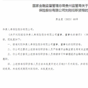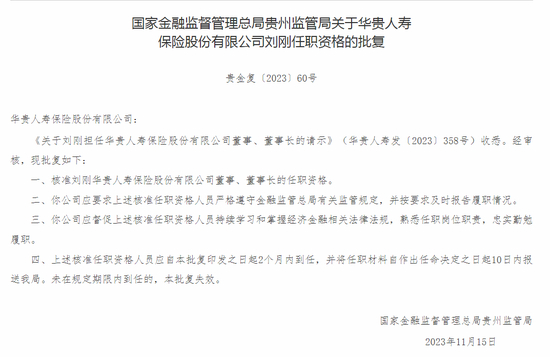 批复文件显示,国家金融监督管理总局贵州监管局已于11月15日核准刘刚华贵人寿保险股份有限公司(以下简称华贵保险)董事、董事长的任职资格。