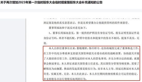 而周福池则表示,就董事会换届事宜,曾征求韶关国资委主任意见,其以国资分管领导刚更换、需要了解情况为由搁置。换届的发起需要是股东行为,而非其本人主导。