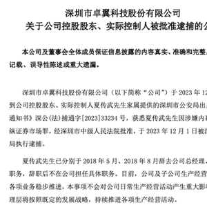 对于夏传武被捕,卓翼科技在12月1日晚公告中表示,目前公司及子公司生产经营运作正常,各项业务稳步推进,该事项不会对公司日常生产经营活动产生重大影响。公司管理层将按照既定的发展战略,持续推进各项生产经营活动。