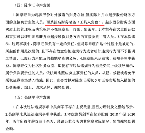 作为时任财务总监,陈章旺表示,他虽为ST起步对外披露的财务总监,但实际上并非起步股份财务方面的直接负责主管人员,而系挂名财务总监(工具人角色)。起步股份财务方面实质上的管理权及决策权并不在陈章旺,而在于邹某军。