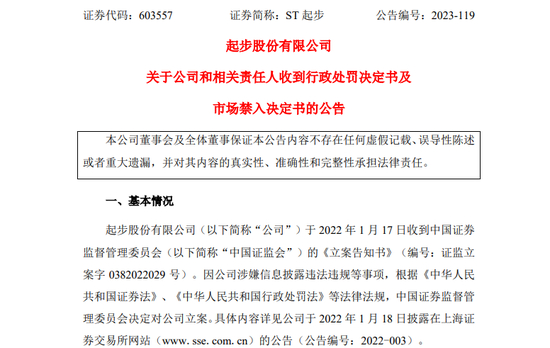 因涉嫌信息披露违法违规等事项被立案近2年后,ST起步(603557)处罚事项终于落地。