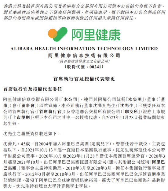 11月29日,阿里健康发布公告称,执行董事沈涤凡已获委任为公司首席执行官及香港联合交易所有限公司证券上市规则项下公司其中一名授权代表,自2023年11月28日营业时间结束起生效。朱顺炎已辞任首席执行官,并将不再担任上市规则项下本公司之授权代表之一,自2023年11月28日营业时间结束起生效,将继续担任执行董事、董事会主席及公司提名委员会主席。