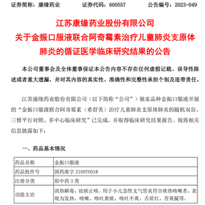 12月7日晚间,康缘药业(600557)披露一则临床研究结果报告显示,不同剂量金振口服液联合阿奇霉素(希舒美)治疗儿童肺炎支原体肺炎均显示了缩短病程、改善病情的作用,临床获益显著,安全性良好。金振口服液为康缘药业的独家品种。