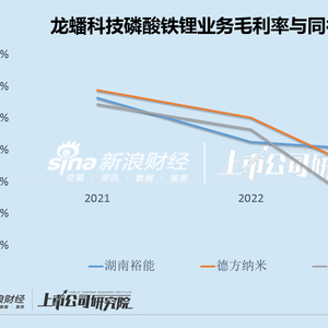 2021年,龙蟠科技锂电材料业务毛利率低于行业前两位的湖南裕能和德方纳米;2022年,公司毛利率介于上述两家同行之间。