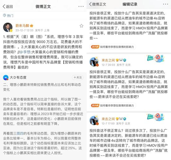 而作为投放平台之一的微博CEO“来总”王高飞也参与讨论,称“投抖音很正常,投放什么广告其实是渠道决定的,新能源车的渠道已经从燃油车的城市边缘4S店转向城市商场的品牌店。哪些平台能给到商场用户‘洗脑’就投哪些。”
