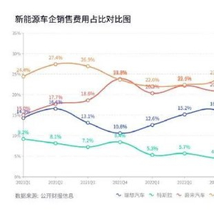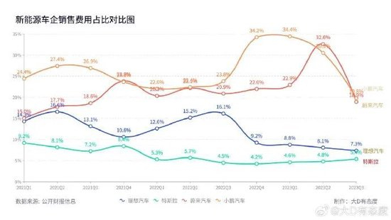 新势力三季度财报发布后,有汽车博主根据特斯拉和“蔚小理”财报披露的近三年销售费用占比数据(销售费用包含行政/营销/销售三者之和),整理做成动态变化图,称这一指标可以简单直接地告诉大家某个品牌卖车是不是容易。