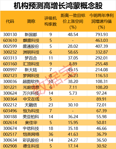 鸿蒙朋友圈中,部分概念股未来增长潜力获机构扎堆看好。数据宝统计,根据5家以上机构一致预测,20股今明两年净利润增速均值有望超30%,包括新国都、麒盛科技、盛通股份、洲明科技等。上述高增长概念股中,以最新收盘价与机构一致预测目标价相比,洲明科技、新大陆、新国都、恺英网络上涨空间超40%,洲明科技上涨空间58.65%居首。