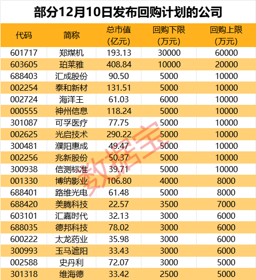 12月10日晚间,据不完全统计,包括郑煤机、珀莱雅、汇成股份、泰和新材、海洋王、神州信息、可孚医疗、光启技术、濮阳惠成在内的超40家A股公司披露回购增持计划。其中郑煤机董事长提议以3亿元-6亿元回购股份,以回购金额上限计算,合计金额26.45亿元,合计总市值2630亿元。