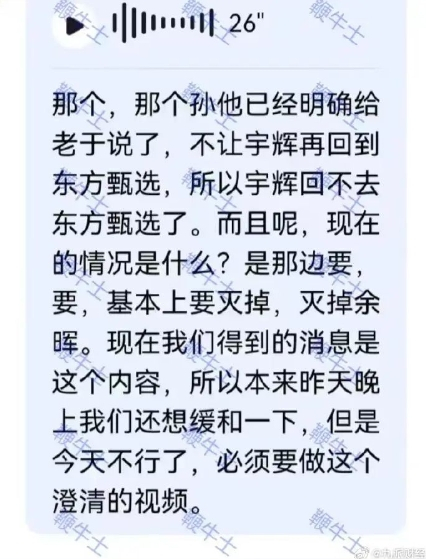 面对潮水般的质疑,俞敏洪发布公开致歉视频,本以为事情将就此告一段落,不料网络开始流传一张聊天记录的截图。内容显示“孙已经明确给老俞说了,不让宇辉再回到东方甄选,所以宇辉回不去东方甄选了。而且那边基本要灭掉,本来昨天晚上要缓和一下,但是今天不行了,必须要做澄清的视频”。