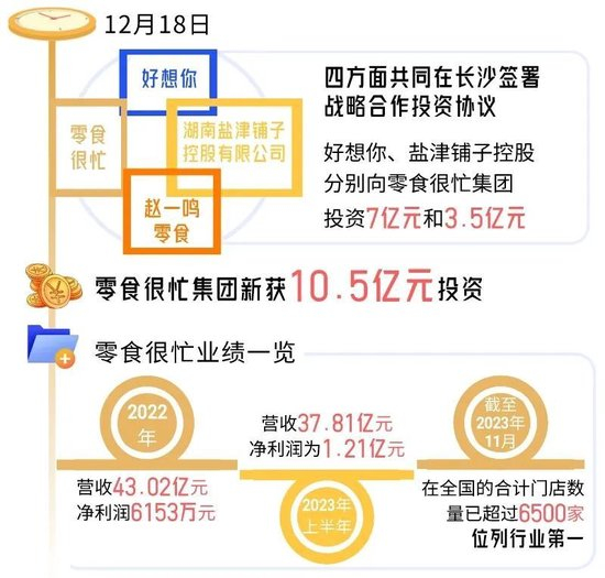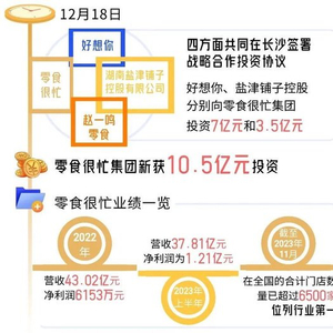 12月18日,好想你、盐津铺子、零食很忙、赵一鸣零食四方共同在长沙签署战略合作投资协议,好想你、盐津铺子分别向零食很忙集团投资7亿元和3.5亿元。