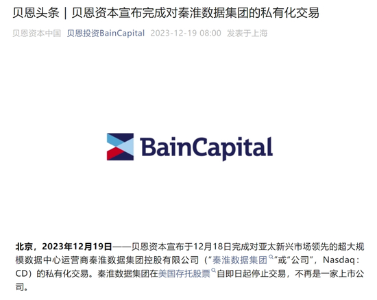 12月19日,贝恩资本宣布已于12月18日完成对秦淮数据(CD.O)的私有化交易,秦淮数据在美国存托股票自即日起停止交易,不再是一家上市公司。