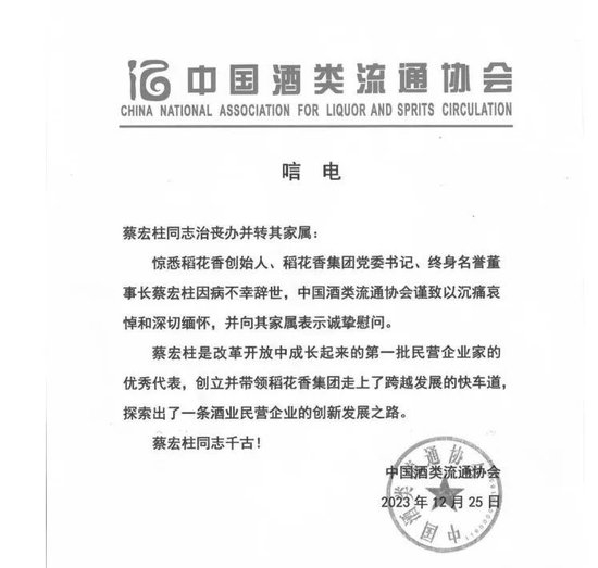 25日,中国酒类流通协会发布唁电称:惊悉稻花香创始人、稻花香集团党委书记、终身名誉董事长蔡宏柱因病不幸辞世,中国酒类流通协会谨致以沉痛哀悼和深切缅怀,并向其家属表示诚挚慰问。