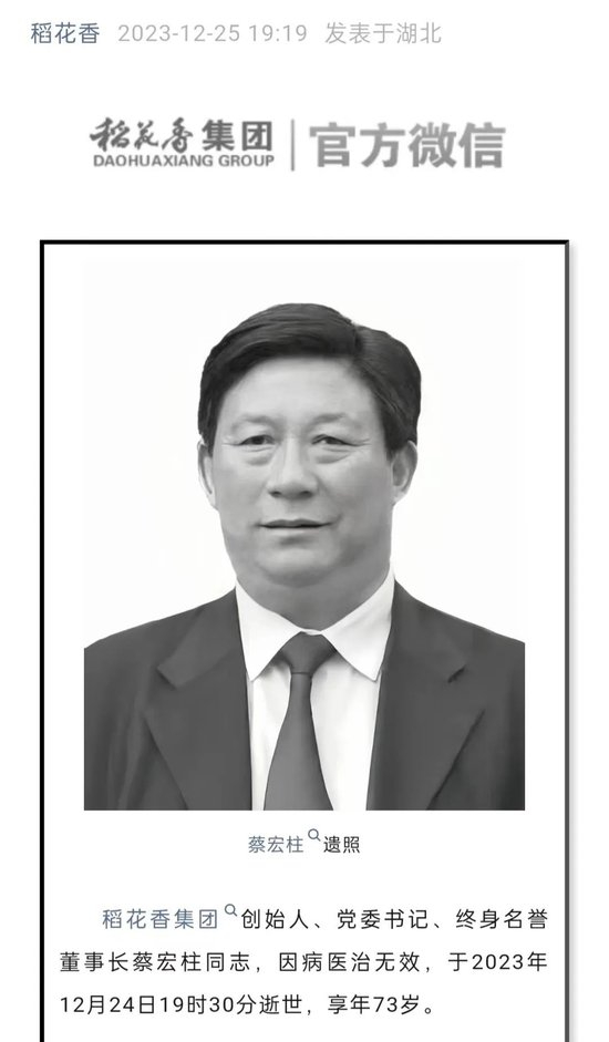12月25日19时许,稻花香集团官微发布讣告:稻花香集团创始人、党委书记、终身名誉董事长蔡宏柱,因病医治无效,于2023年12月24日19时30分逝世,享年73岁。