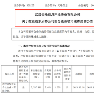 截至公告披露日,同喻投资持有天喻信息1.06亿股股份,占上市公司总股本比例为24.58%。累计被冻结股份数量为7010.99万股,合计占其所持股份比例66.33% ,合计占公司总股本比例16.3%。