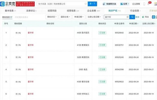 东方优选(北京)科技有限公司,早在2022年6月24日就申请了17个类别的“董宇辉”注册商标,包括医疗园艺、教育娱乐、啤酒饮料、食品、餐饮住宿、材料加工等。