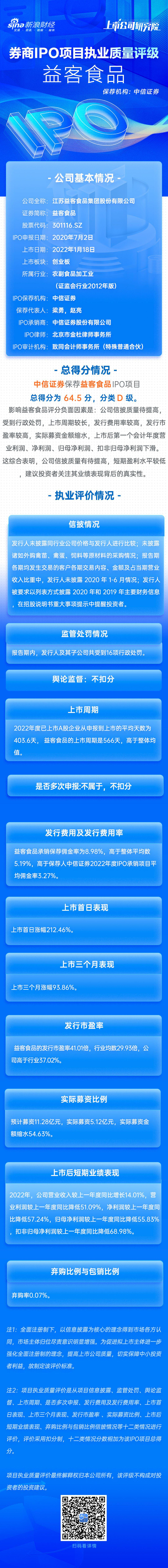 中信证券保荐益客食品IPO项目质量评级D级 承销保荐佣金率较高 扣非归母净利润大降近7成