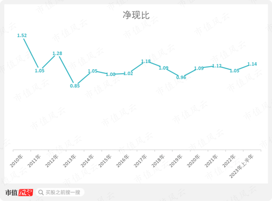 公司的净现比也基本长期维持在1以上。截至2023年上半年,该指标为1.14,盈利质量可靠。