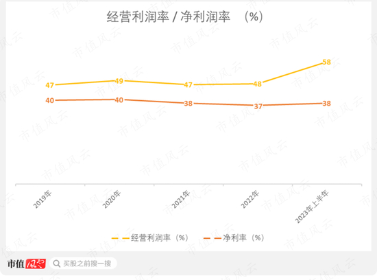 盈利能力方面,经营利润率和净利润率保持稳定。截至2023年上半年,这两项指标分别为58%、38%。