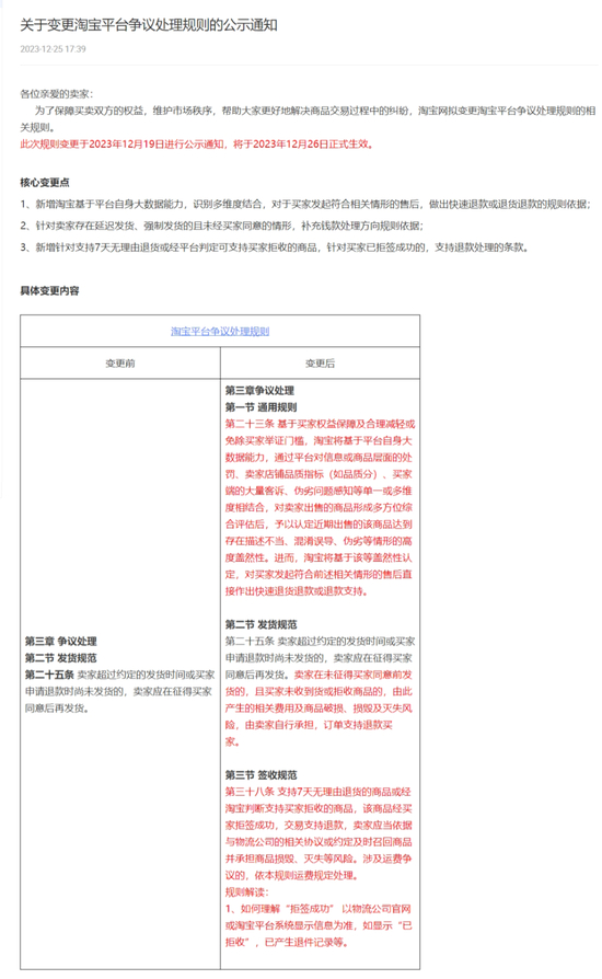 最近,淘宝对外发布了关于变更《淘宝平台争议处理规则》的公示通知,该通知从昨天开始正式生效。今日相关话题冲上热搜第一。