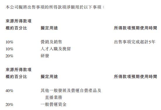 具体来看,此次出售所得款项净额的10%将用于营销及销售,10%将用于人才入职及挽留,20%用于研发,40%用于其他一般发展及营运自营产品、直播业务,20%用于一般营运资金。