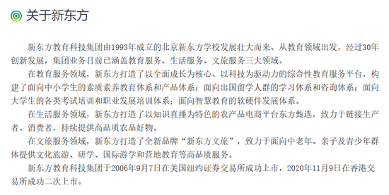 新东方作为东方甄选的控股股东,在官网介绍其三大业务包含在生活服务领域,打造了以知识直播为特色的农产品电商平台东方甄选,致力于连接生产者、消费者,持续提供高品质农品好物。