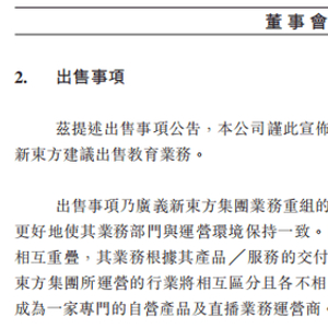 完成此次出售后,东方甄选与新东方将不再有任何教育业务的关联交易。作为教育业务转让的不可或缺部分,所有与东方甄选经营在线教育业务有关的协议及交易,将终止或转让给新东方(或由新东方重新进入)。