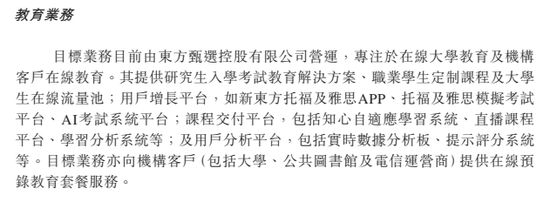 据东方甄选公告介绍,此次拟出售的目标业务,专注在线大学教育及机构客户在线教育,提供研究生入学考试教育解决方案、职业学生定制课程,以及大学生在线流量池。
