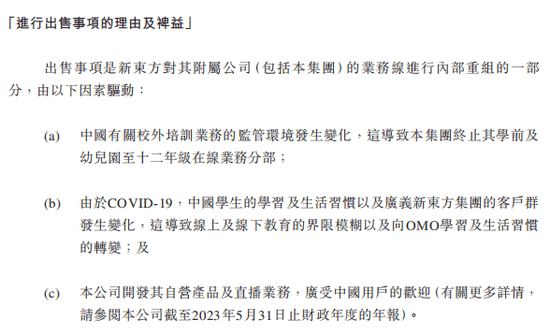 此次出售事项完成后,东方甄选将不再经营在线教育业务,旨在更明确地划分业务线,以及更好地使业务部门与运营环境保持一致。