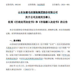 2023年8月,因涉嫌信息披露违法违规,如意集团和公司实控人邱亚夫被证监会立案。同年12月,公司收到证监会山东监管局下发的《行政处罚及市场禁入事先告知书》。今年1月4日,公司收到山东证监局下发的《行政处罚决定书》。