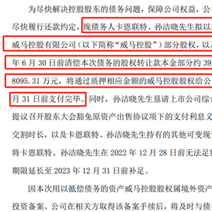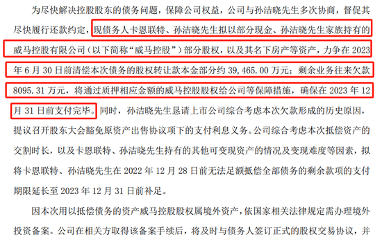 据2022年12月公告,卡恩联特、孙洁晓拟以部分现金、孙洁晓家族持有的威马控股有限公司(下称“威马汽车”)部分股权,以及其名下房产等资产,确保在2023年6月30日前清偿股权转让款本金部分约3.95亿元;剩余业务往来欠款8095.31万元,将通过质押相应金额的威马控股股权给公司等保障措施,确保在2023年12月31日前支付完毕。