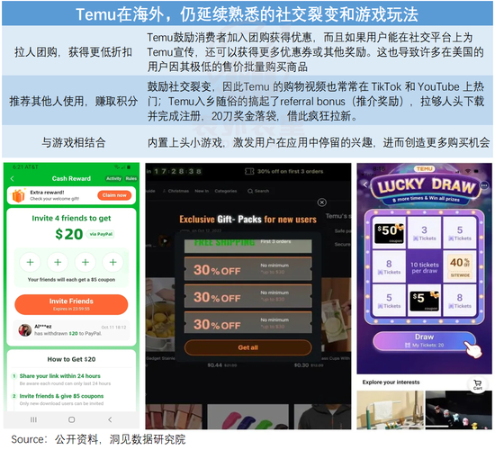 可以看到,Temu延续拼多多模式,低价白牌,叠加大额折扣和社交裂变等玩法,价格低得感人——商品价格大多集中在0.09至20美元之间。