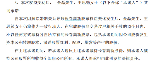 而金磊宣布离婚之后,市场也对是否减持产生了疑问。公告显示,自本次因解除婚姻关系导致长春高新股东权益变化发生后,金磊、王思勉仍将作为一致行动人,在完成股份非交易过户相关手续的12个月内,不以任何方式减持各自所持有的长春高新股票,包括承诺期间因公司股份发生资本公积转增股本、派送股票红利、配股、增发等产生的股份。在上述承诺期间,若承诺人违反上述承诺减持长春高新股份,则承诺人减持公司股票所得收益全部归公司所有,承诺人将承担由此引发的法律责任。