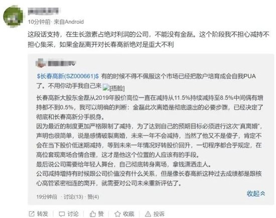 在此背景下,金磊对长春高新的作用不言而喻,其离婚和转让股权已经引发了部分投资者的担忧。雪球论坛上就有用户认为:“金磊离婚是彻底退出的重要步骤。像长春高新这种过去成绩都是跟核心高管紧密相连的离开,就需要对公司未来重新评估了。”