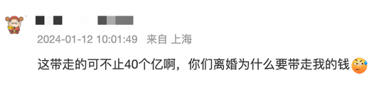 有投资者表示,“这带走的可不止40个亿啊,你们离婚为什么要带走我的钱?”还有投资者戏称,“为他们离婚送了份子钱。”