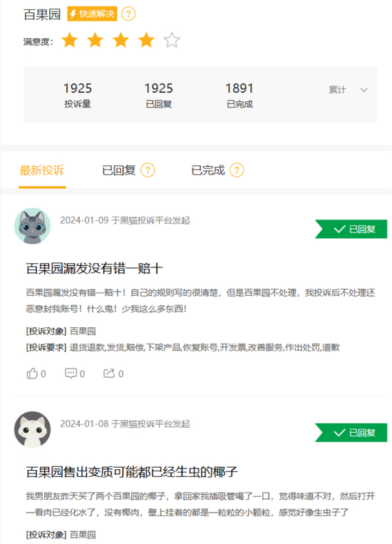 截至1月16日,在黑猫投诉平台上,百果园的投诉量有1925条,已完成1891条。在这些投诉中,关于百果园的食品安全成为核心问题,其包括了存在异物、发霉、变质、过期等。