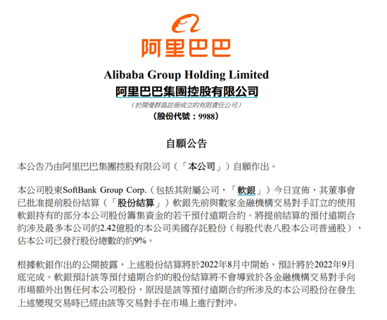 作为对比,2022年8月,阿里曾披露另一份软银提前结算若干预付远期合约的公告,涉及至多约2.42亿股ADR,占阿里已发行总股本的9%。